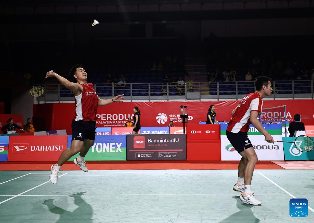 China's Ren Xiangyu/Tan Qiang (R) compete during the men's doubles round of 32 match against Malaysia's Ong Yew Sin/Teo Ee Yi at Malaysia Masters 2023 in Kuala Lumpur, Malaysia, May 23, 2023. (Photo by Wong Fok Loy/Xinhua)