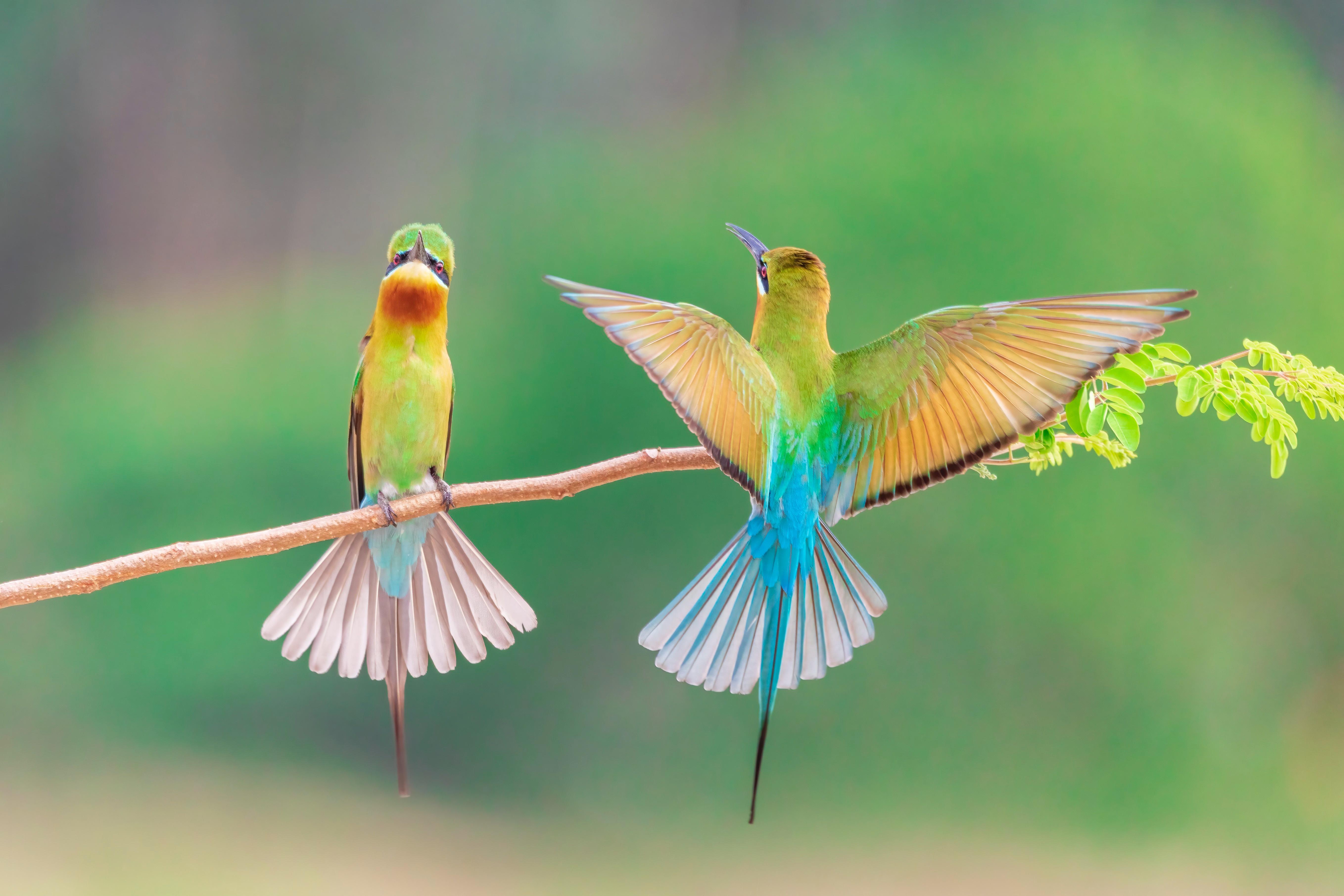 Photo shows two blue-tailed bee-eaters at a scenic spot in Caotan township, suixi county, Zhanjiang, south China’s Guangdong Province. (Photo/Lan Weiqiang)