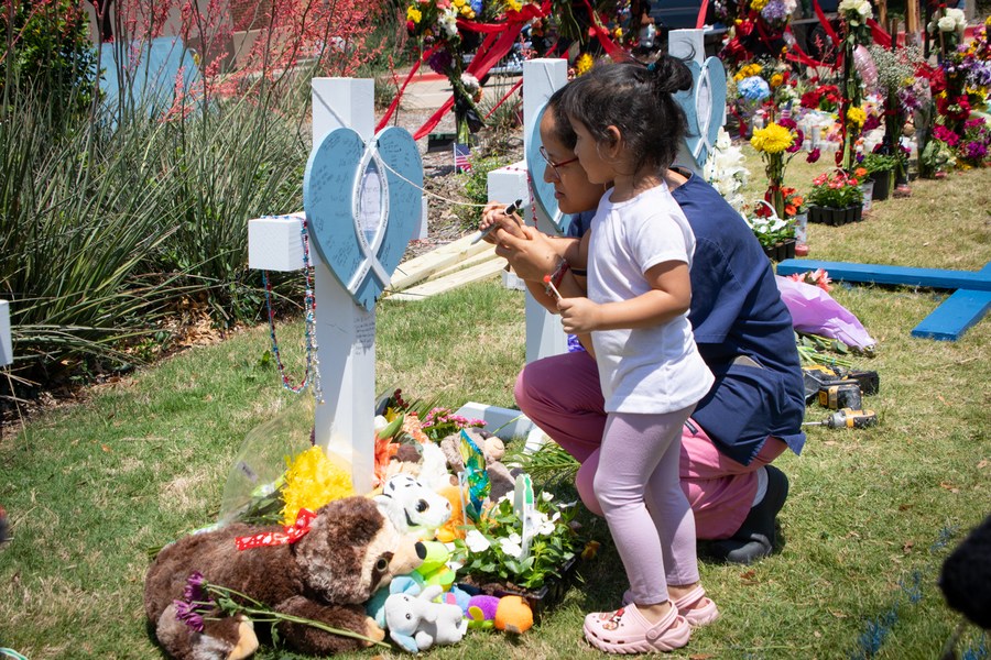 A woman helps a girl write on a memory board to mourn victims of a mass shooting in front of an outlet mall in Allen, Texas, the United States, on May 8, 2023. (Photo by Dan Tian/Xinhua)