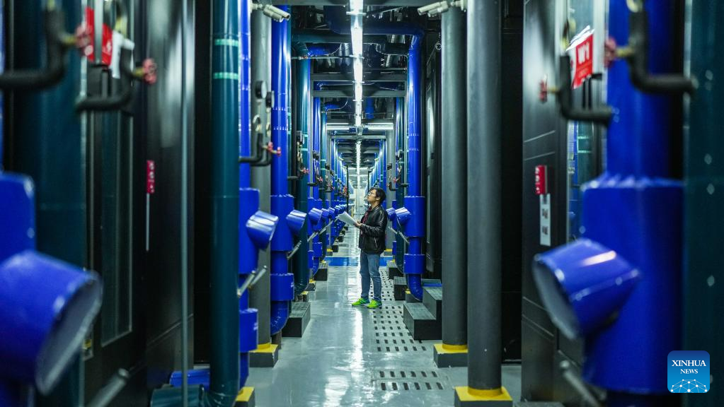 A staff member inspects the micro module room in Guian Data Center of China Unicom in Guian New Area, southwest China's Guizhou Province, on May 23, 2023. In February 2022, China started work on the project to build an integrated national big data system involving the establishment of eight national computing hubs and 10 national data center clusters. Guizhou is one of the eight hubs and construction of many data center projects are in full swing. (Xinhua/Tao Liang)