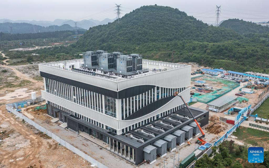 This aerial photo taken on May 23, 2023 shows the construction site of the data center of the State Power Investment Corporation Limited in Guian New Area, southwest China's Guizhou Province. In February 2022, China started work on the project to build an integrated national big data system involving the establishment of eight national computing hubs and 10 national data center clusters. Guizhou is one of the eight hubs and construction of many data center projects are in full swing. (Xinhua/Tao Liang)