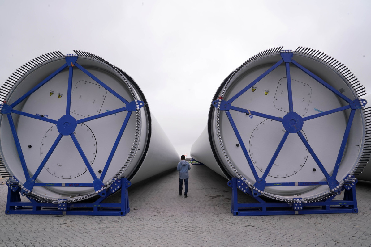 A person walks by the wind power facility components at an offshore wind power port in Nantong Jiangsu province on May 18, 2023. [Photo/Xinhua]