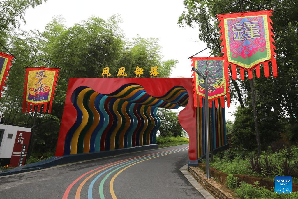This photo taken on May 24, 2023 shows a view of the entrance to Pushan Village of Longyou County, east China's Zhejiang Province. Pushan Village has donned a new look with improved public infrastructure and colorful decoration in the past years. Entertainment facilities and homestay businesses have also been developed to boost tourism and increase local villagers' income, injecting momentum and vitality into rural revitalization. (Xinhua/Du Xiaoyi)