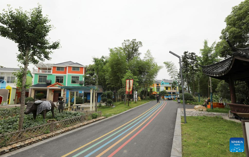 This photo taken on May 24, 2023 shows a public play area of a homestay in Pushan Village of Longyou County, east China's Zhejiang Province. Pushan Village has donned a new look with improved public infrastructure and colorful decoration in the past years. Entertainment facilities and homestay businesses have also been developed to boost tourism and increase local villagers' income, injecting momentum and vitality into rural revitalization. (Xinhua/Du Xiaoyi)
