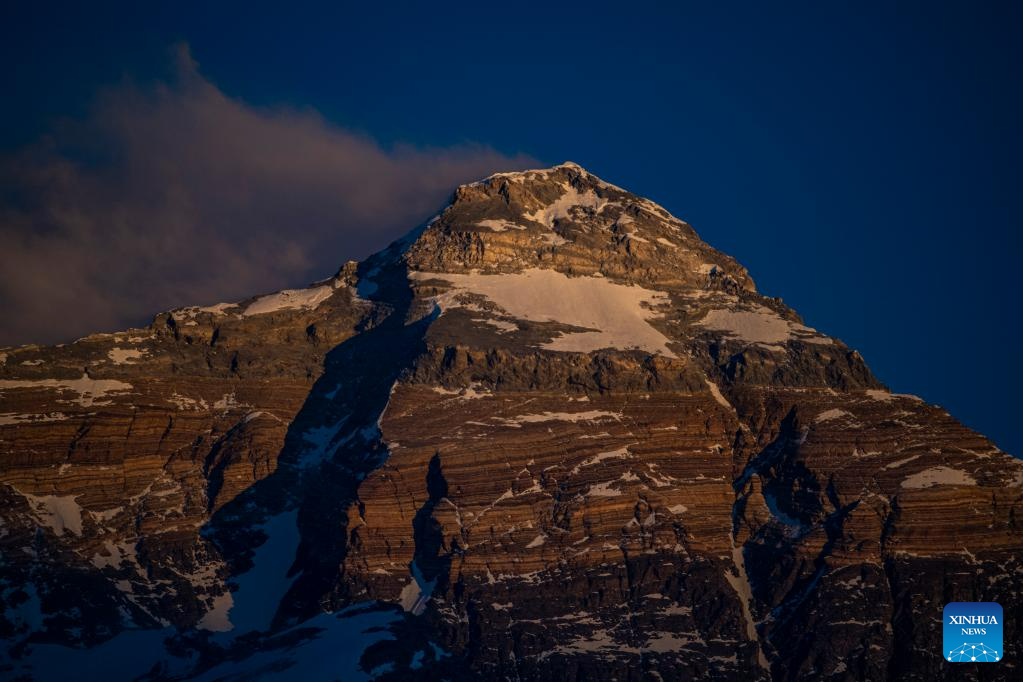 This photo taken on May 11, 2023 shows a view of Mount Qomolangma in the sunset in southwest China's Tibet Autonomous Region. (Xinhua/Sun Fei)