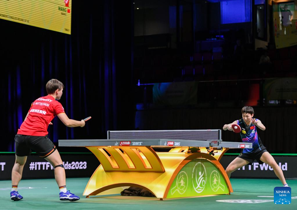Wang Manyu (R) of China hits a return during the women's singles round of 16 match against Nina Mittelham of Germany at 2023 ITTF Table Tennis World Championships Finals in Durban, South Africa, May 25, 2023. (Xinhua/Li Yahui)