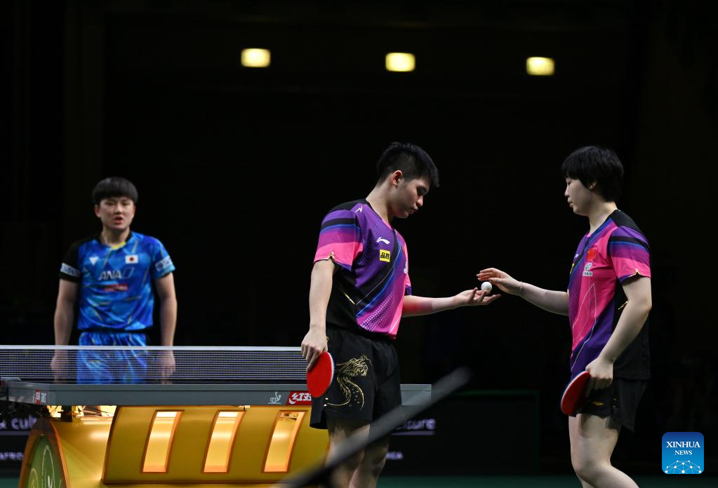 Lin Shidong/Kuai Man(L) of China compete during the mixed doubles semifinal match against Harimoto Tomokazu/Hayata Hina of Japan at 2023 ITTF Table Tennis World Championships Finals in Durban, South Africa, May 25, 2023. (Xinhua/Tao Xiyi)