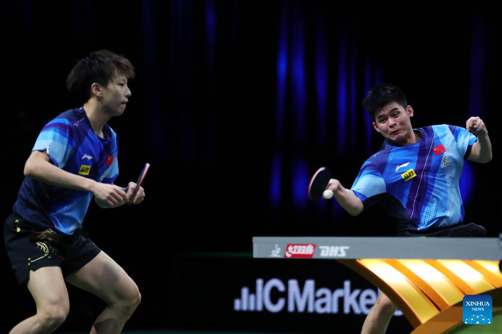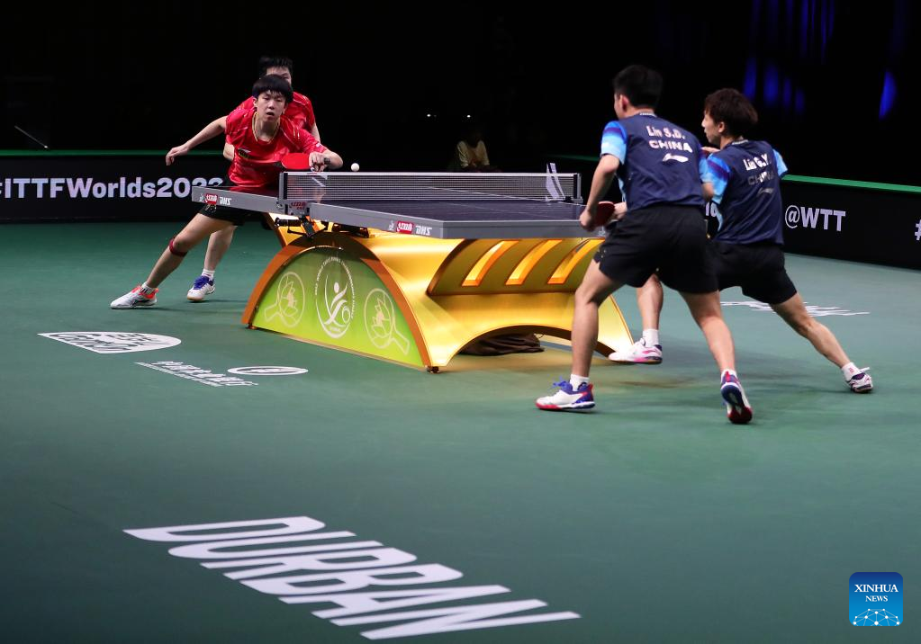 Lin Gaoyuan/Lin Shidong (R) of China compete during the men's doubles quarterfinal against their teammates Fan Zhendong/Wang Chuqin at 2023 ITTF Table Tennis World Championships Finals in Durban, South Africa, May 25, 2023. (Xinhua/Wang Dongzhen)