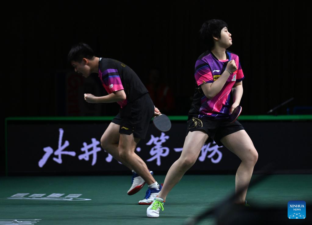 Lin Shidong/Kuai Man(R) of China react during the mixed doubles semifinal match against Harimoto Tomokazu/Hayata Hina of Japan at 2023 ITTF Table Tennis World Championships Finals in Durban, South Africa, May 25, 2023. (Xinhua/Tao Xiyi)