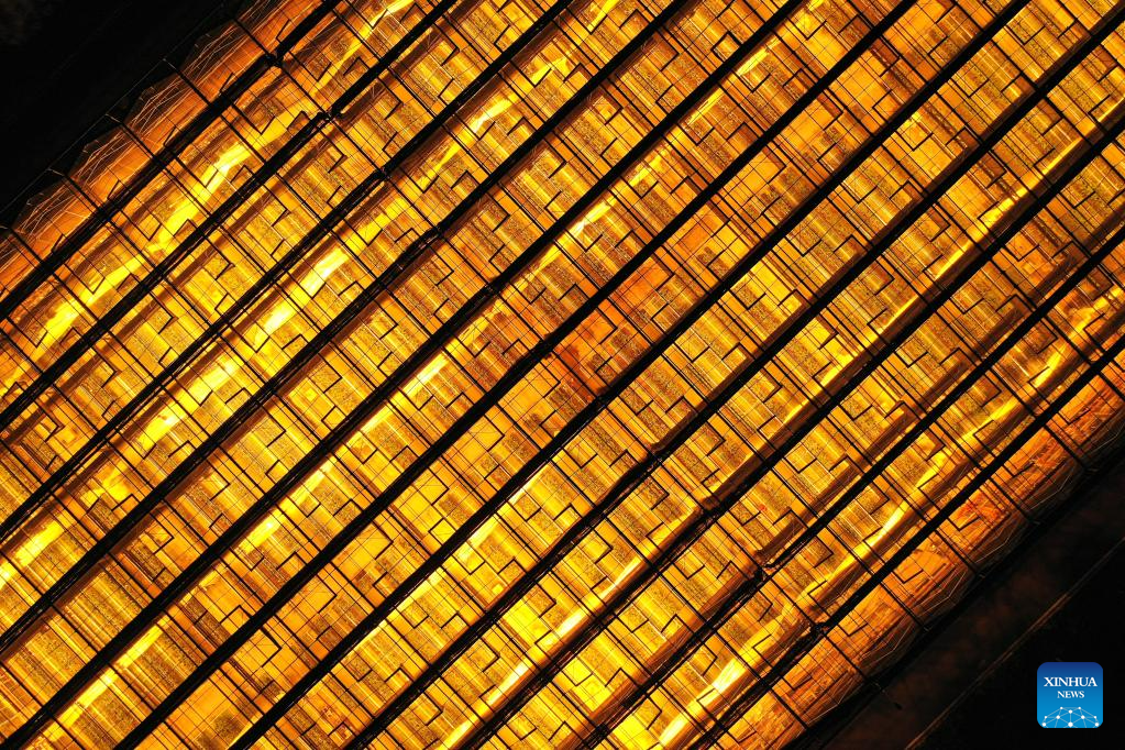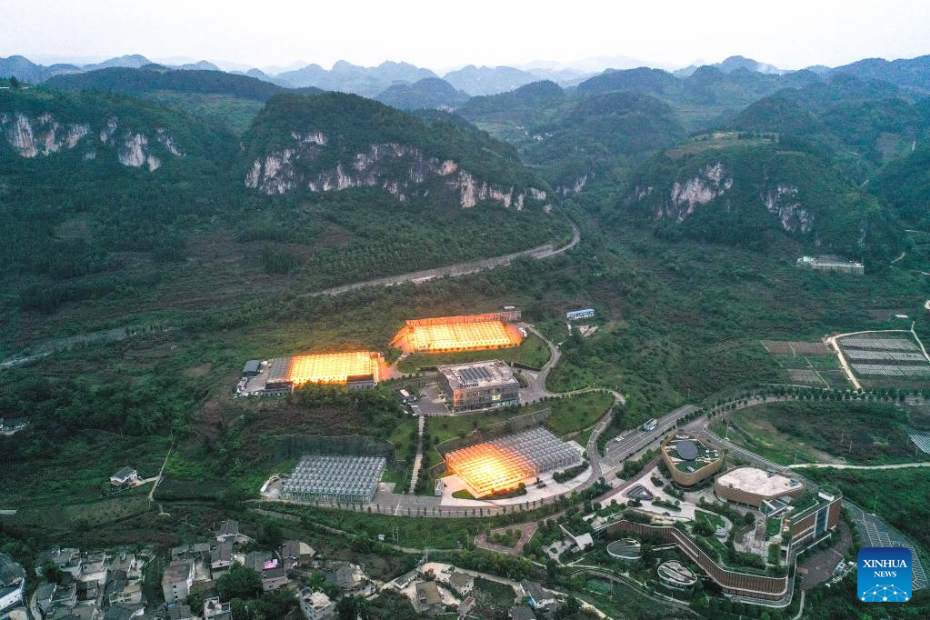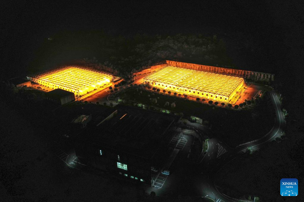 This aerial photo taken on May 23, 2023 shows a view of night light supplement in a seedling greenhouse in Kaiyang County of Guiyang, southwest China's Guizhou Province. In recent years, relying on the development of big data, Guizhou Province has accelerated the promotion and application of new models of smart agriculture, so as to improve agricultural production efficiency. (Xinhua/Yang Wenbin)