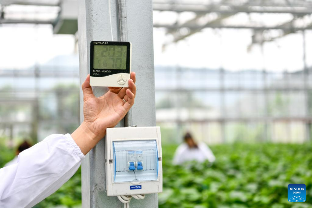A worker checks the temperature and humidity at a seedling greenhouse in Kaiyang County of Guiyang, southwest China's Guizhou Province, May 23, 2023. In recent years, relying on the development of big data, Guizhou Province has accelerated the promotion and application of new models of smart agriculture, so as to improve agricultural production efficiency. (Xinhua/Yang Wenbin)