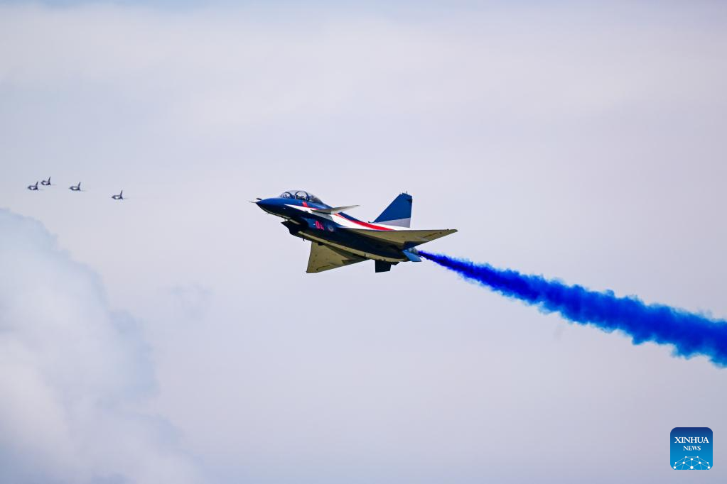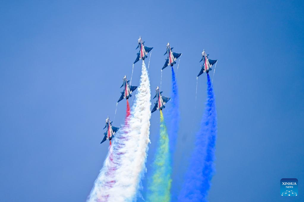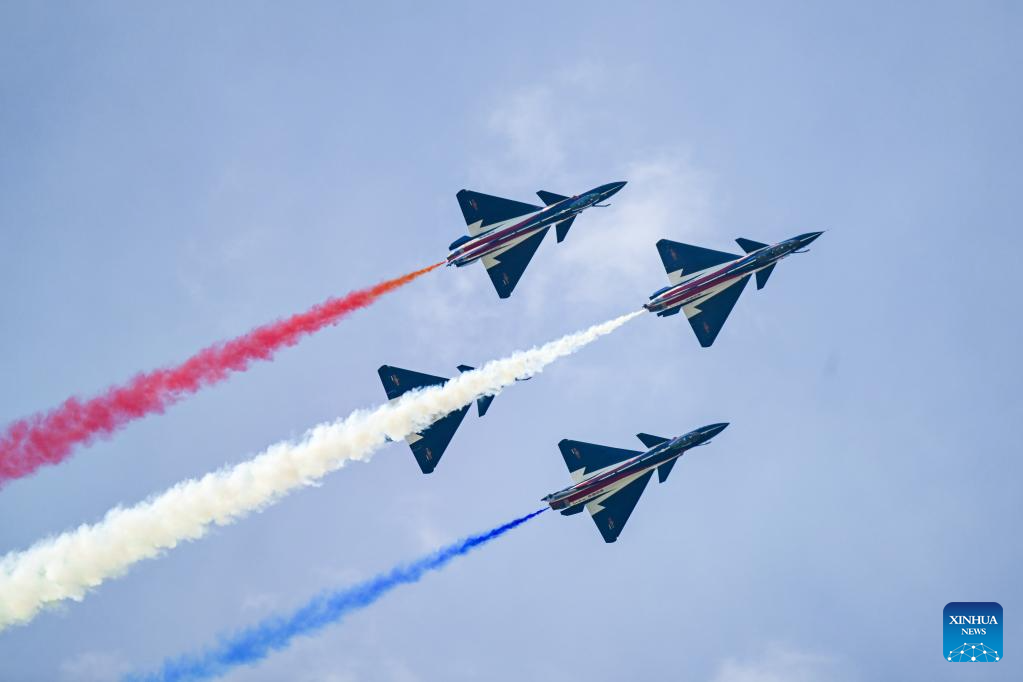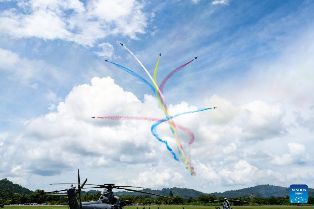 The Chinese People's Liberation Army (PLA) Air Force's August 1st aerobatics team performs at the 16th Langkawi International Maritime and Aerospace Exhibition (LIMA 2023) in Langkawi, Malaysia, May 25, 2023. (Xinhua/Zhu Wei)