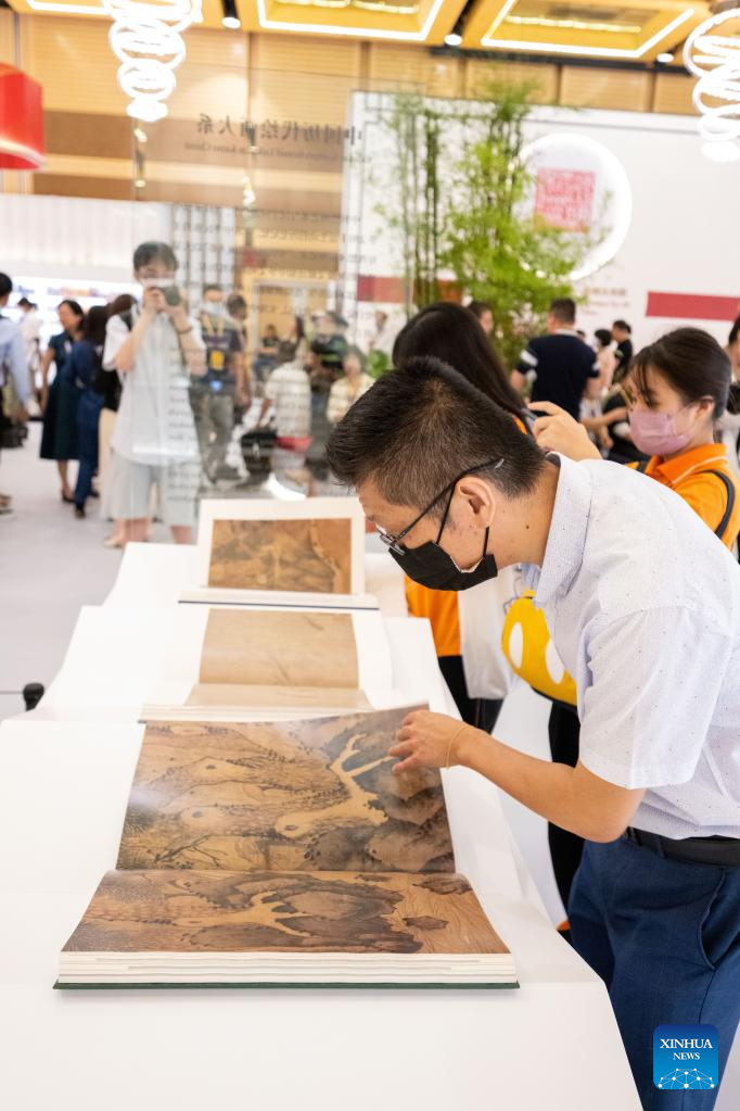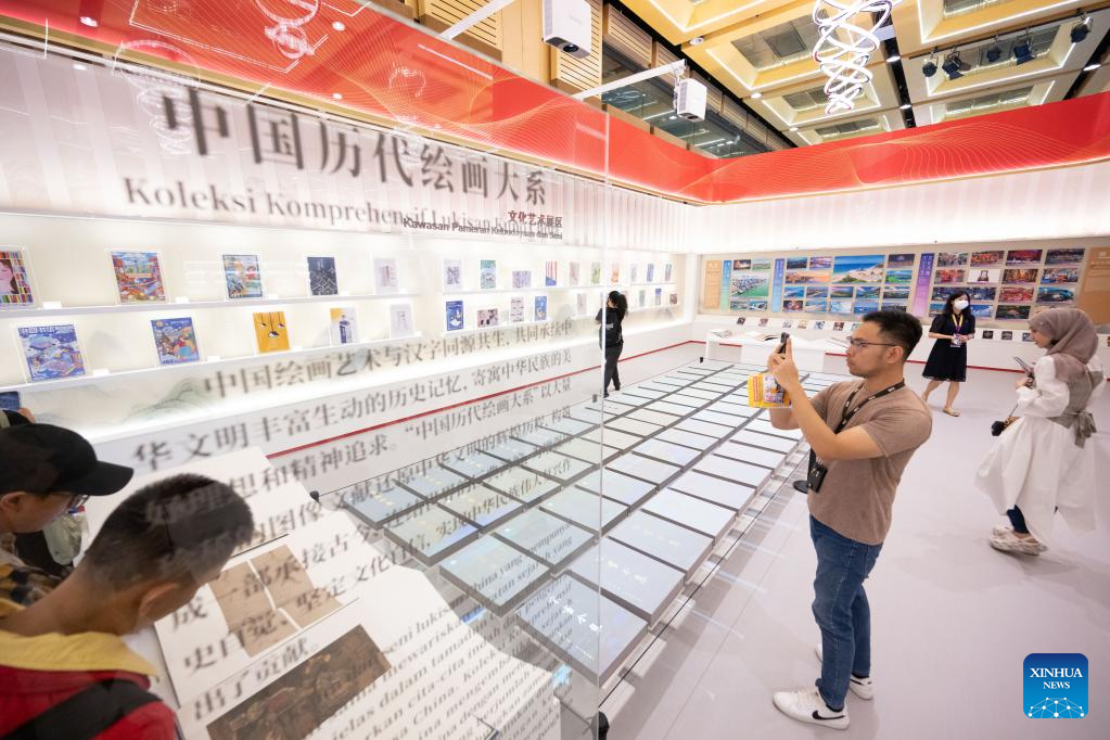People visit an exhibition on a comprehensive collection of ancient Chinese paintings at the 40th Kuala Lumpur International Book Fair in Kuala Lumpur, Malaysia, May 26, 2023. (Xinhua/Zhu Wei)