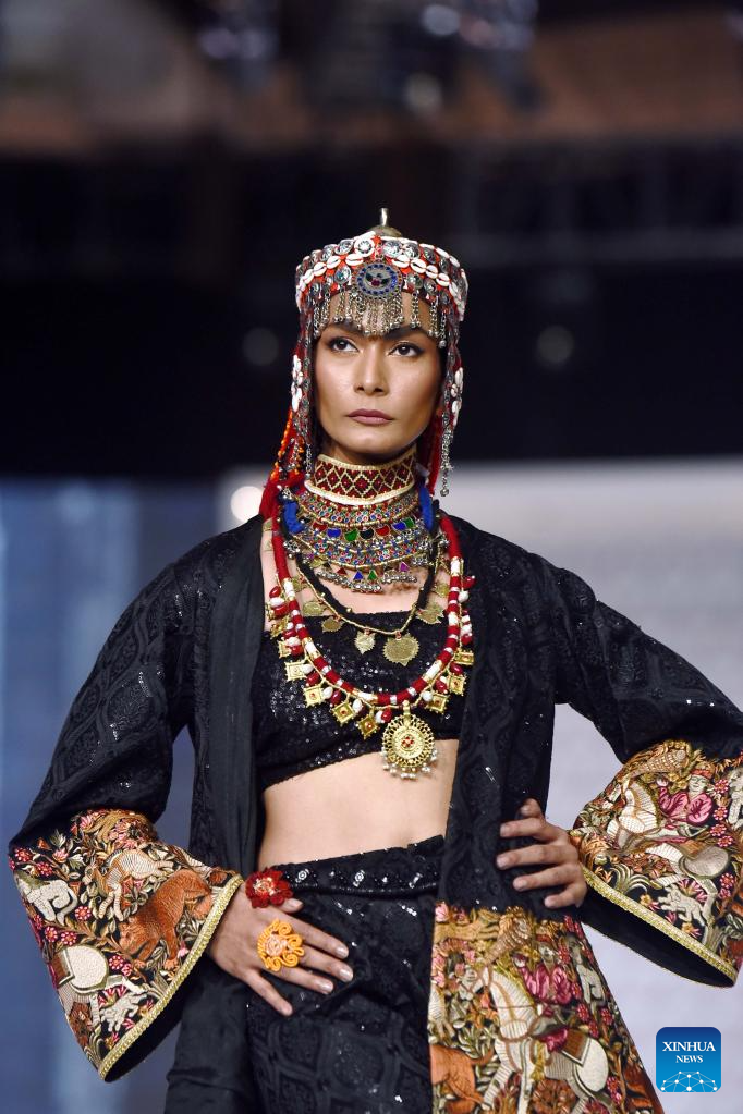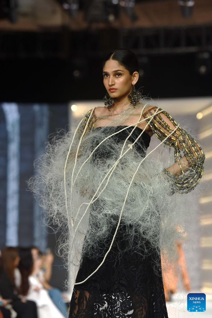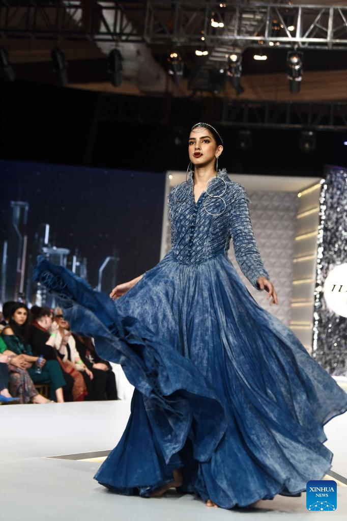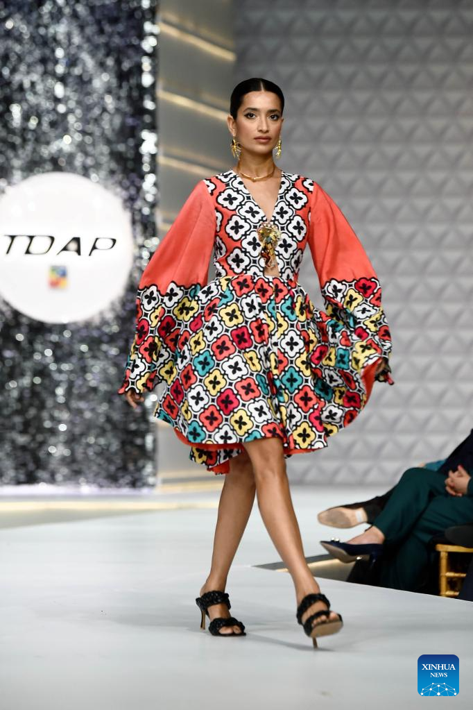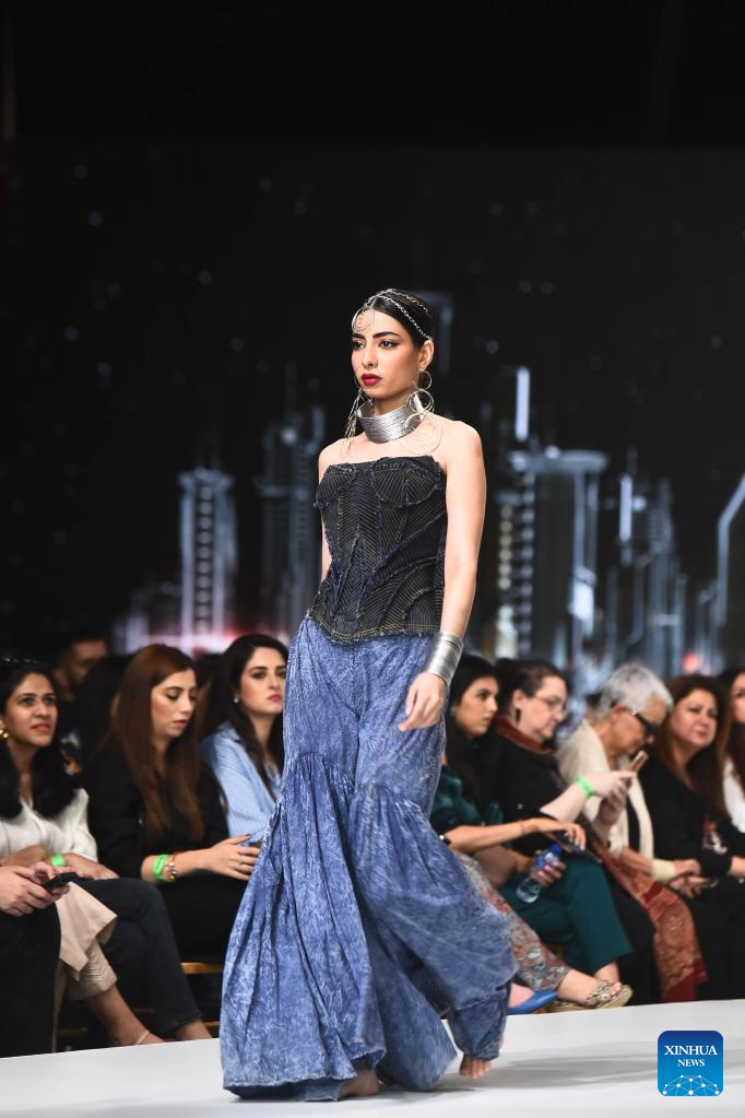 A model presents a creation during a fashion show organized by the Trade Development Authority of Pakistan (TDAP) in Karachi, Pakistan, on May 26, 2023. (Str/Xinhua)