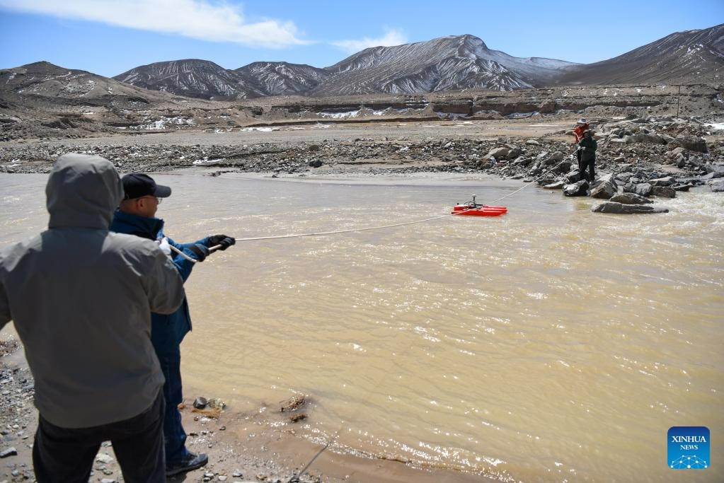 Researchers test the river velocity and discharge in the Kumkol Basin in the east of the Kunlun Mountains, northwest China's Xinjiang Uygur Autonomous Region, May 22, 2023. Recently, researchers from the Xinjiang Institute of Ecology and Geography under the Chinese Academy of Sciences have launched a scientific expedition to investigate water resources on the northern slope of the Kunlun Mountains. (Xinhua/Ding Lei)
