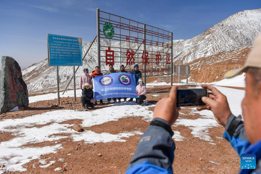 Researchers pose for a group photo at Altun Mountains National Nature Reserve in northwest China's Xinjiang Uygur Autonomous Region, May 23, 2023. Recently, researchers from the Xinjiang Institute of Ecology and Geography under the Chinese Academy of Sciences have launched a scientific expedition to investigate water resources on the northern slope of the Kunlun Mountains. (Xinhua/Ding Lei)