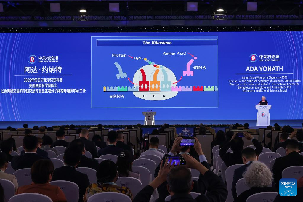 Ada Yonath, the 2009 Nobel Prize winner in chemistry, member of the National Academy of Sciences of the United States, and director of the Helen and Milton A. Kimmelman Center for Biomolecular Structure and Assembly of the Weizmann Institute of Science of Israel, speaks via video during the plenary meeting of the 2023 Zhongguancun Forum (ZGC Forum) in Beijing, capital of China, May 26, 2023. Themed "Open Cooperation for a Shared Future," the 2023 Zhongguancun Forum held a plenary meeting here on Friday. (Xinhua/Zhang Yuwei)