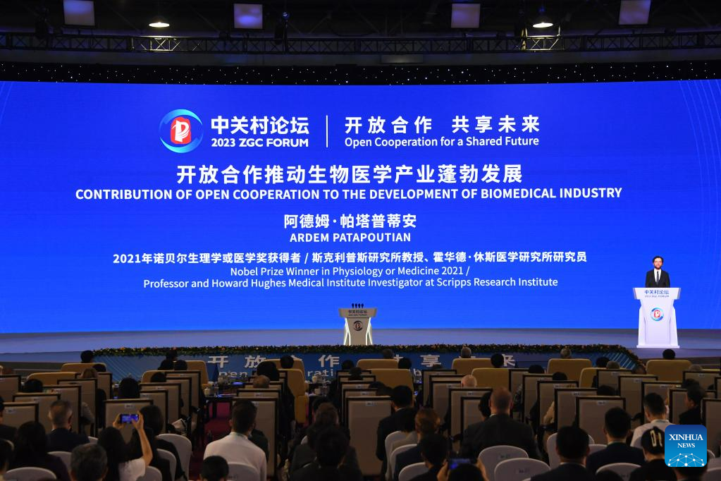 Ardem Patapoutian, the 2021 Nobel Prize winner in Physiology or Medicine, professor and Howard Hughes Medical Institute investigator at Scripps Research Institute, speaks via video during the plenary meeting of the 2023 Zhongguancun Forum (ZGC Forum) in Beijing, capital of China, May 26, 2023. Themed "Open Cooperation for a Shared Future," the 2023 Zhongguancun Forum held a plenary meeting here on Friday. (Xinhua/Ren Chao)