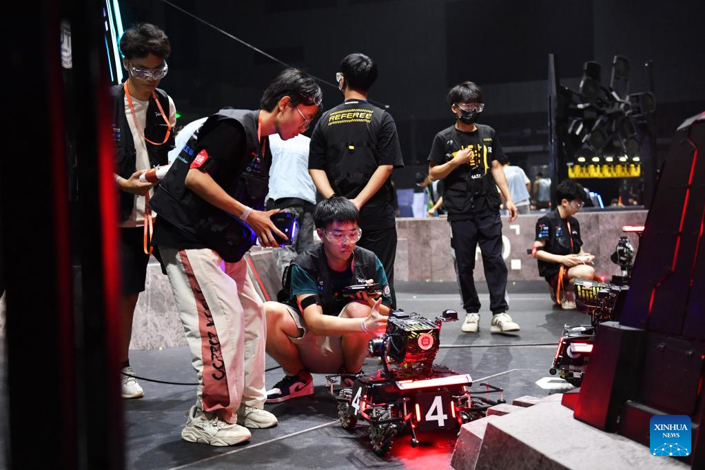 Contestants of team TOE from Dalian Jiaotong University test their robots during the RoboMaster 2023 University Championship Regional Competition (South China) in Changsha, central China's Hunan Province, May 28, 2023. The four-day regional competition concluded in Changsha on Sunday, with team RobotPilots from Shenzhen University winning the first place and team TOE from Dalian Jiaotong University being the second. (Xinhua/Chen Zhenhai)