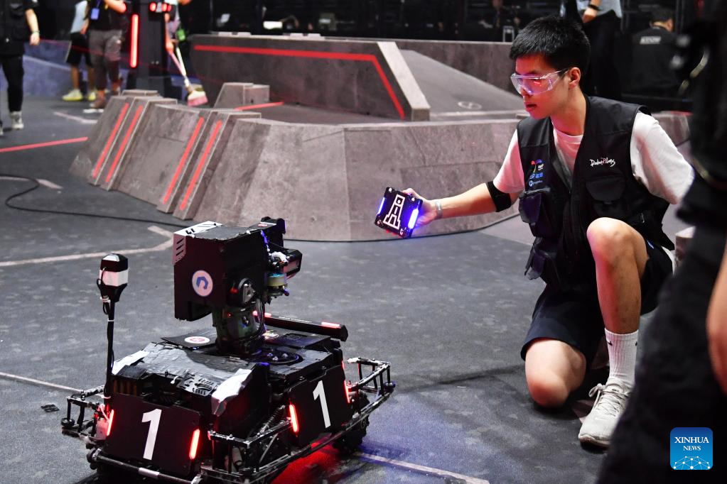 A contestant of team TOE from Dalian Jiaotong University tests a robot during the RoboMaster 2023 University Championship Regional Competition (South China) in Changsha, central China's Hunan Province, May 28, 2023. The four-day regional competition concluded in Changsha on Sunday, with team RobotPilots from Shenzhen University winning the first place and team TOE from Dalian Jiaotong University being the second. (Xinhua/Chen Zhenhai)