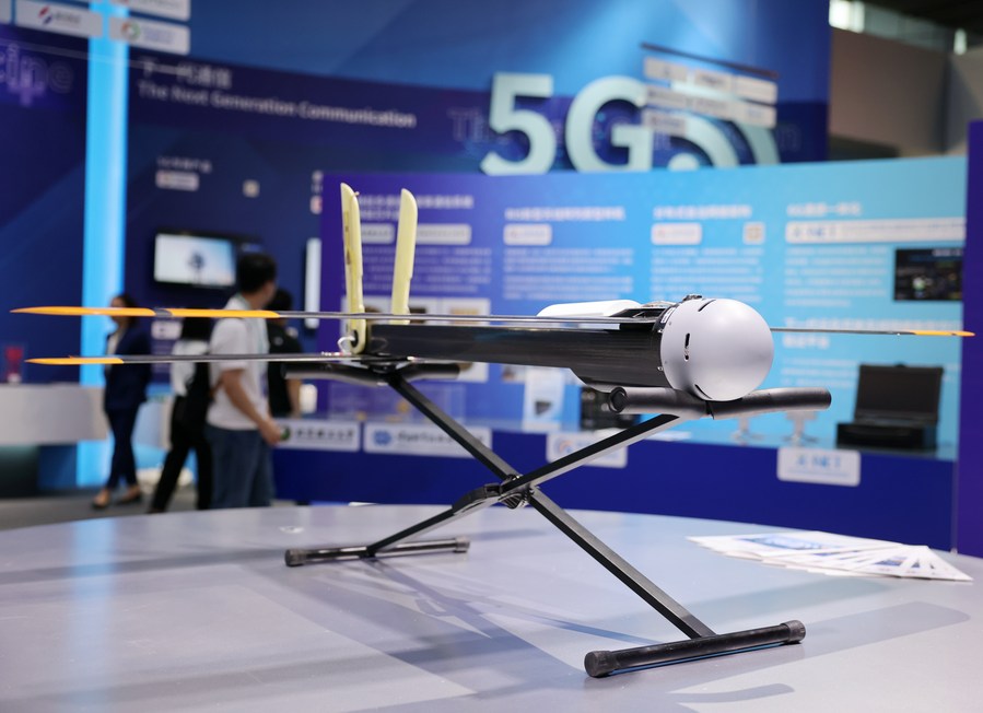 This photo taken on May 26, 2023 shows a drone with emergency broadcasting equipment at the exhibition center of Zhongguancun National Independent Innovation Demonstration Zone in Beijing, capital of China. (Xinhua/Zhang Chenlin)