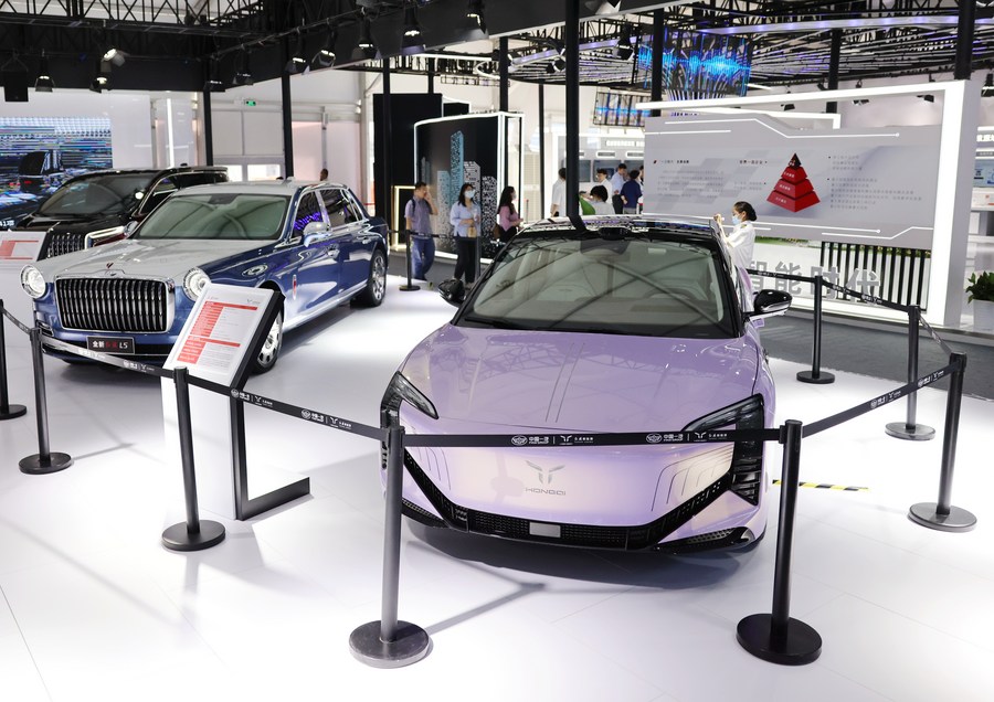 This photo taken on May 26, 2023 shows new energy and intelligent connected vehicles displayed at the exhibition center of Zhongguancun National Independent Innovation Demonstration Zone in Beijing, capital of China. (Xinhua/Ren Chao)