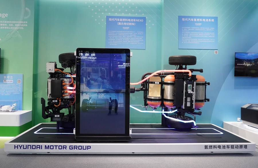 This photo taken on May 26, 2023 shows a Hyundai hydrogen fuel cell vehicle for display at the exhibition center of Zhongguancun National Independent Innovation Demonstration Zone in Beijing, capital of China. (Xinhua/Ren Chao)