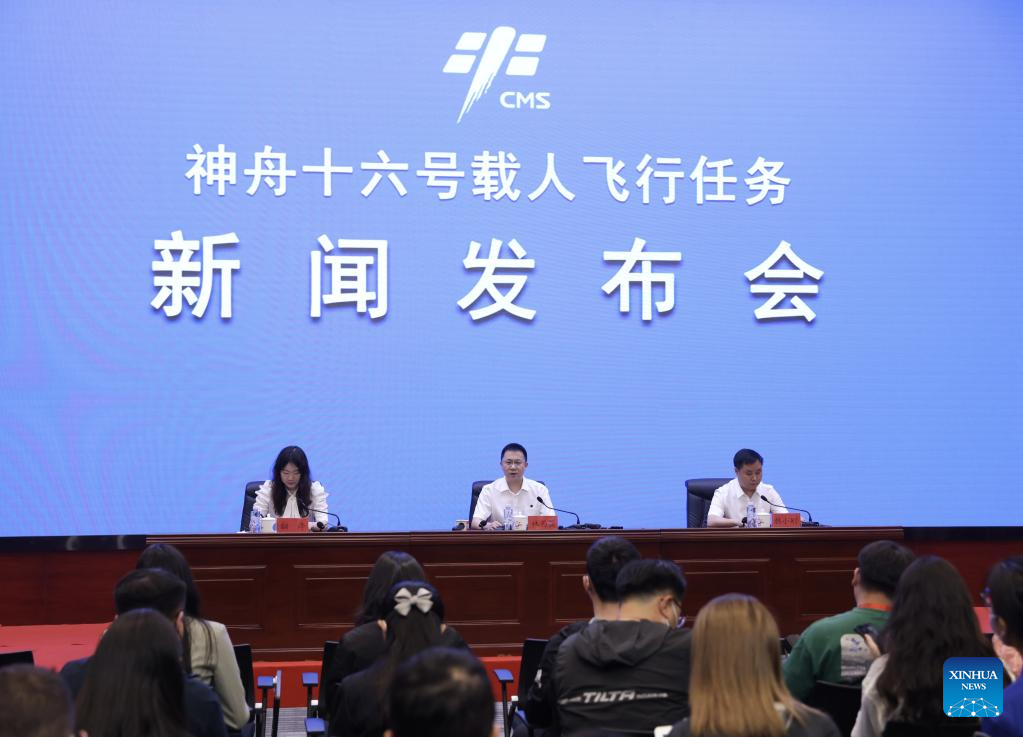 The spaceship will carry three astronauts -- Jing Haipeng, Zhu Yangzhu and Gui Haichao -- to carry out the Shenzhou-16 spaceflight mission. Jing will be the commander, said Lin Xiqiang, deputy director of the CMSA, at a press conference.