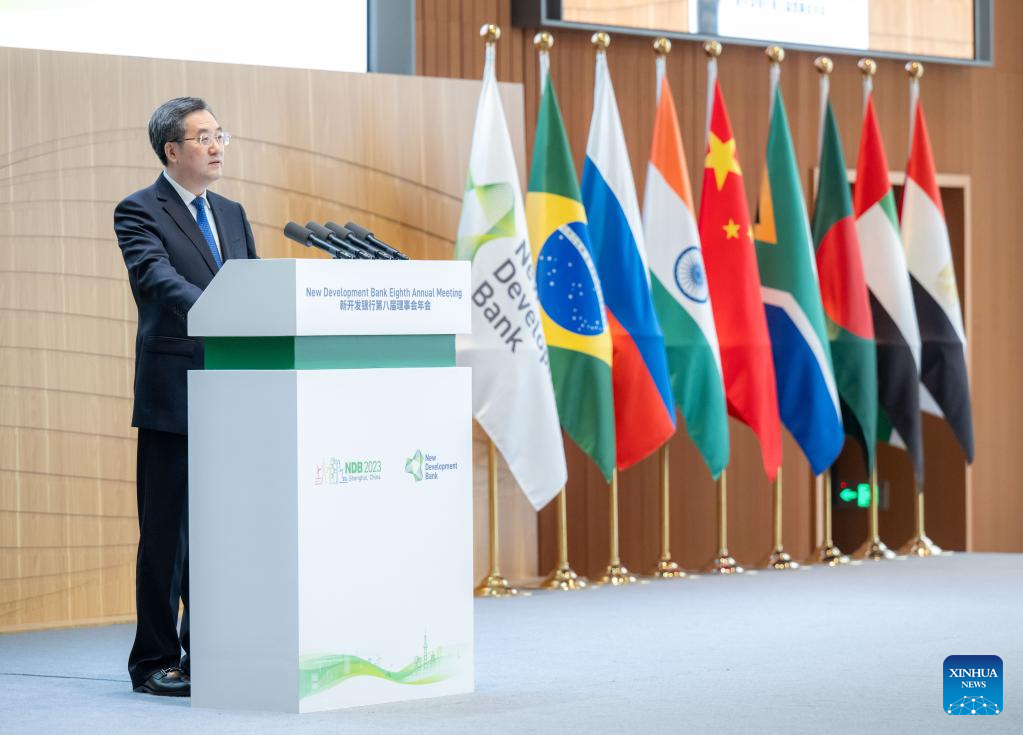 Chinese Vice Premier Ding Xuexiang, also a member of the Standing Committee of the Political Bureau of the Communist Party of China Central Committee, addresses the opening ceremony of the eighth annual meeting of the New Development Bank (NDB) held in Shanghai, east China, May 30, 2023. (Xinhua/Zhai Jianlan)