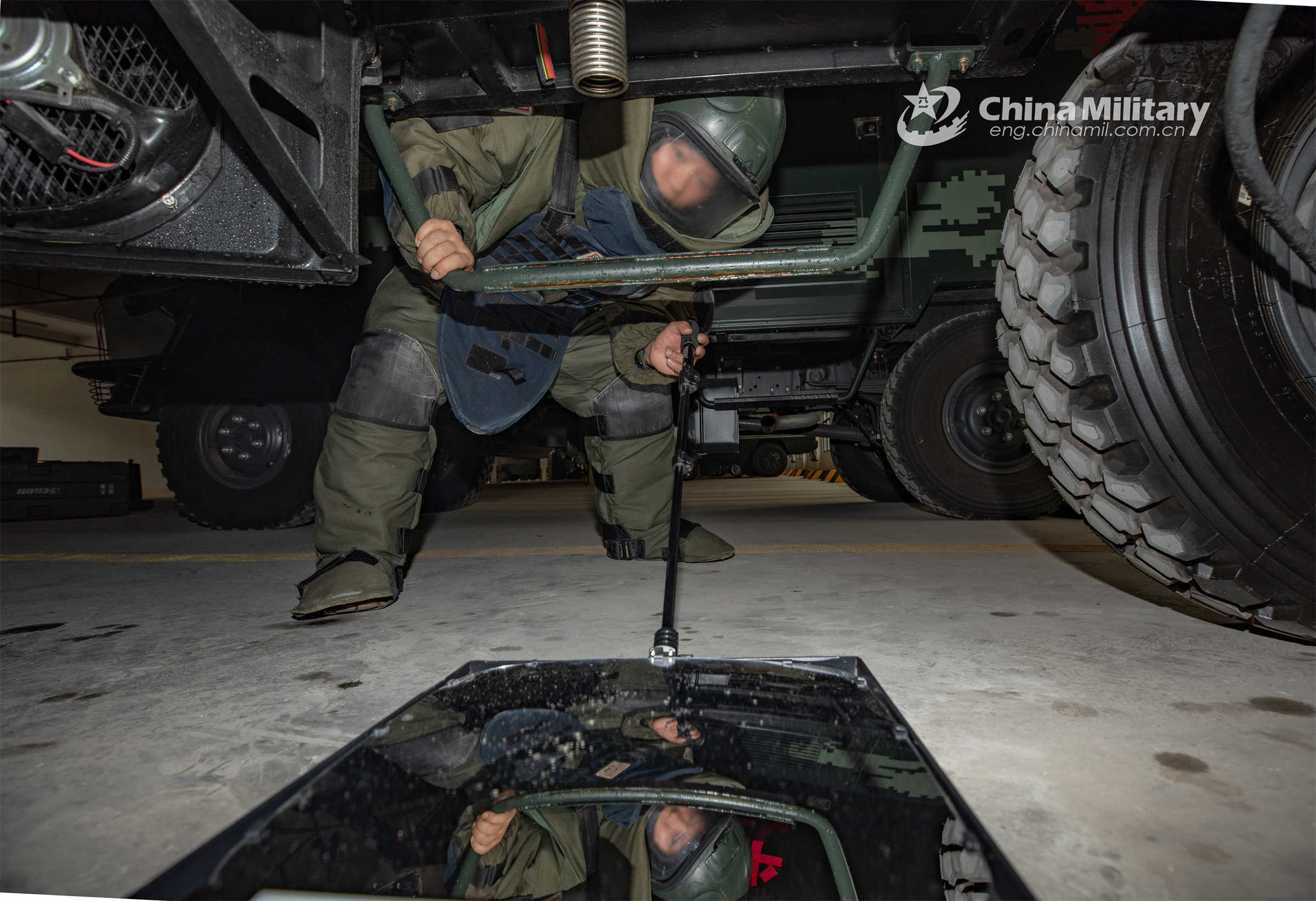 A soldier assigned to a mobile detachment under the Chinese People's Armed Police (PAP) Force Guangxi Corps uses a mirror to inspect the undercarriage of a vehicle during an explosive ordnance disposal (EOD) training exercise in late May, 2023. (eng.chinamil.com.cn/Photo by Liu Ming)