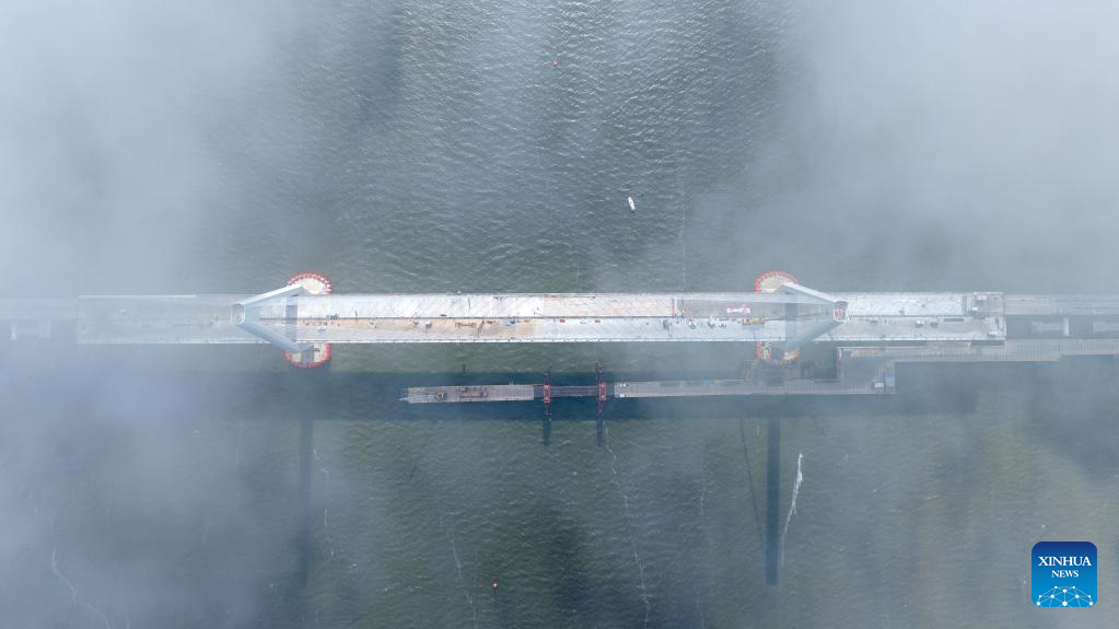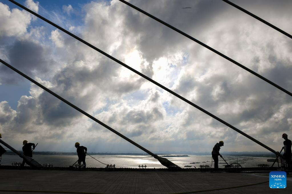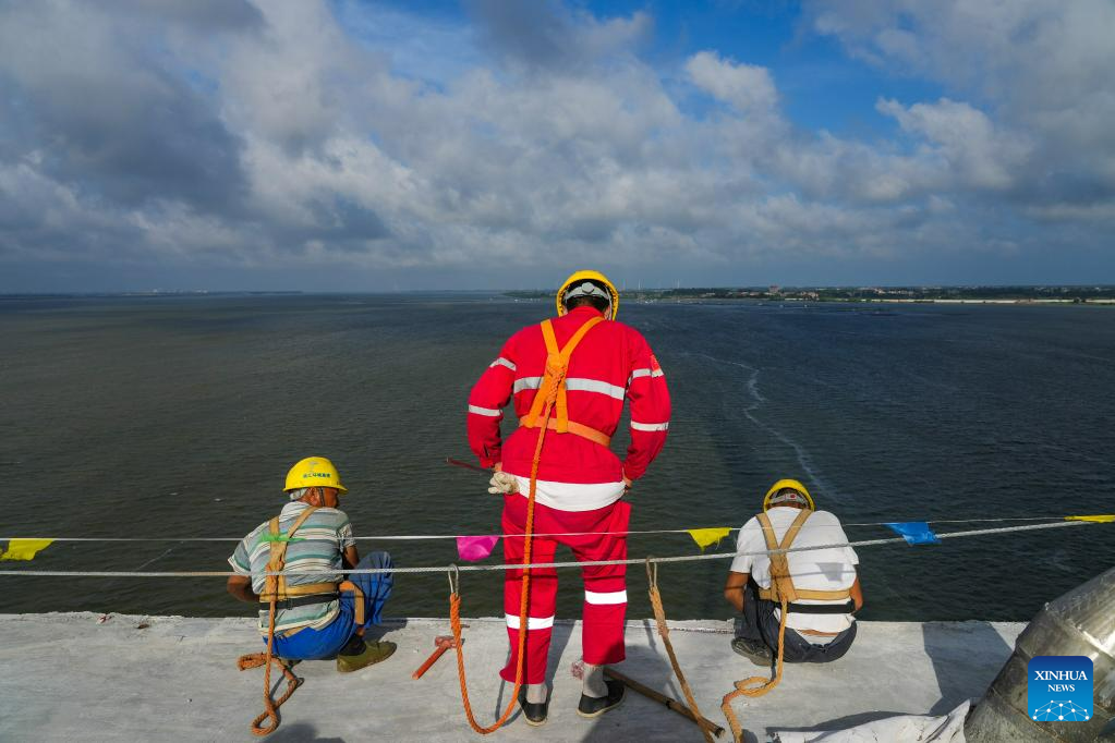 Laborers work on the Luzhou grand bridge in Zhanjiang City, south China's Guangdong Province, May 25, 2023. The cross-sea Luzhou grand bridge, with a total length of 562 meters and a main span of 300 meters, has entered the final stage of construction. (Xinhua/Lu Hanxin)