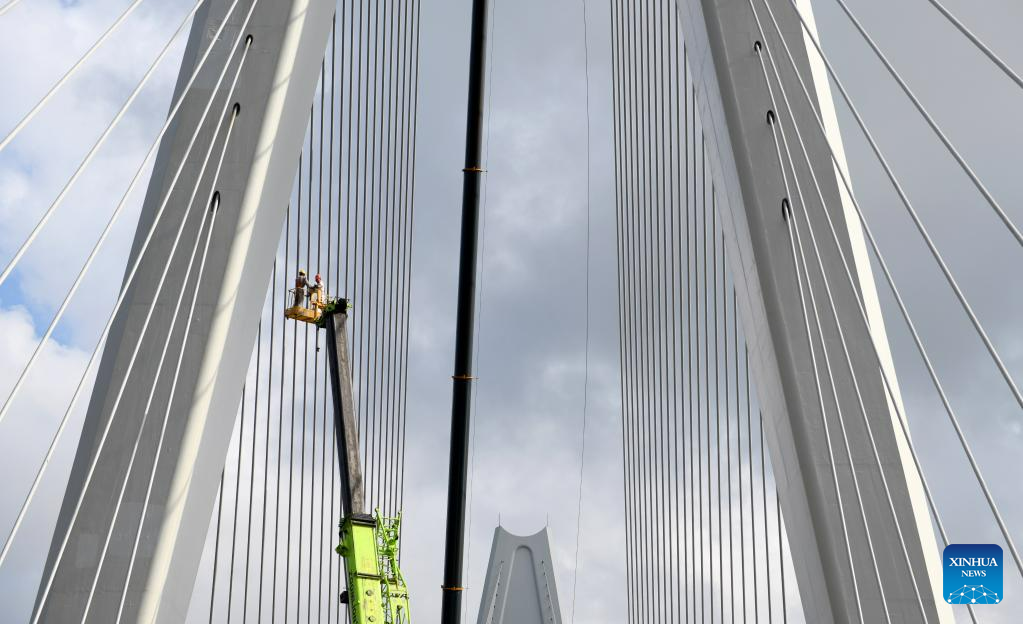 Laborers prepare to install a guardrail on the Luzhou grand bridge in Zhanjiang City, south China's Guangdong Province, May 25, 2023. The cross-sea Luzhou grand bridge, with a total length of 562 meters and a main span of 300 meters, has entered the final stage of construction. (Xinhua/Liu Dawei)