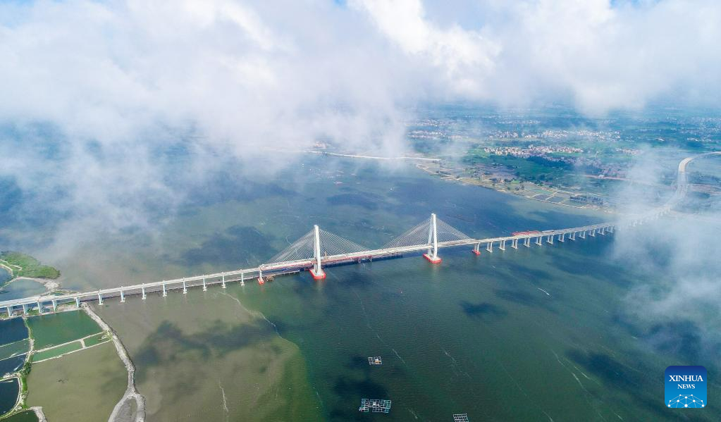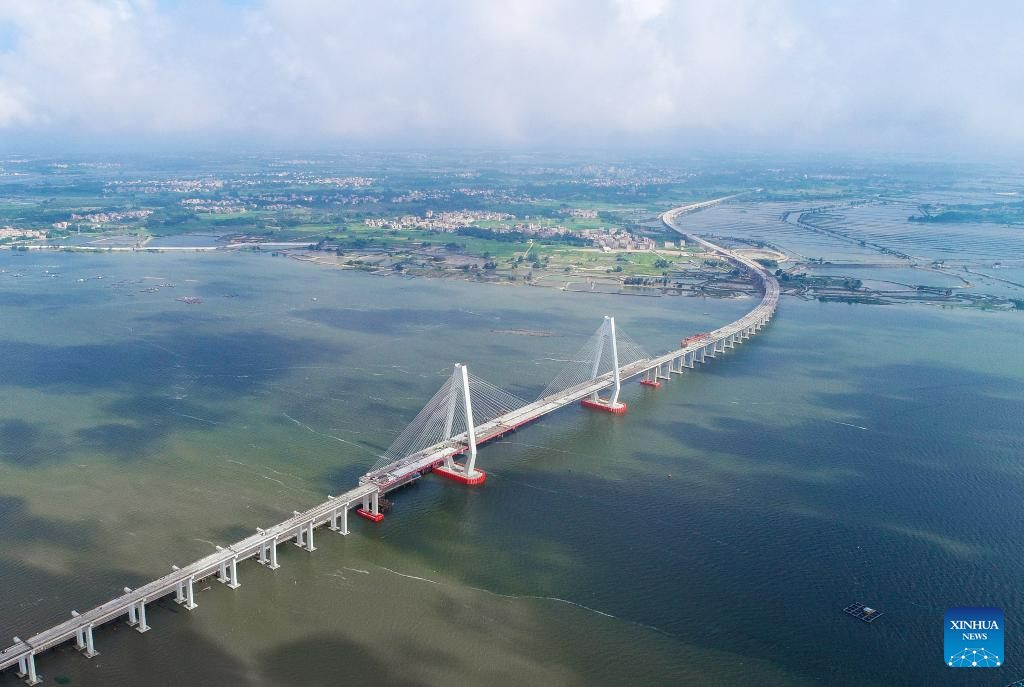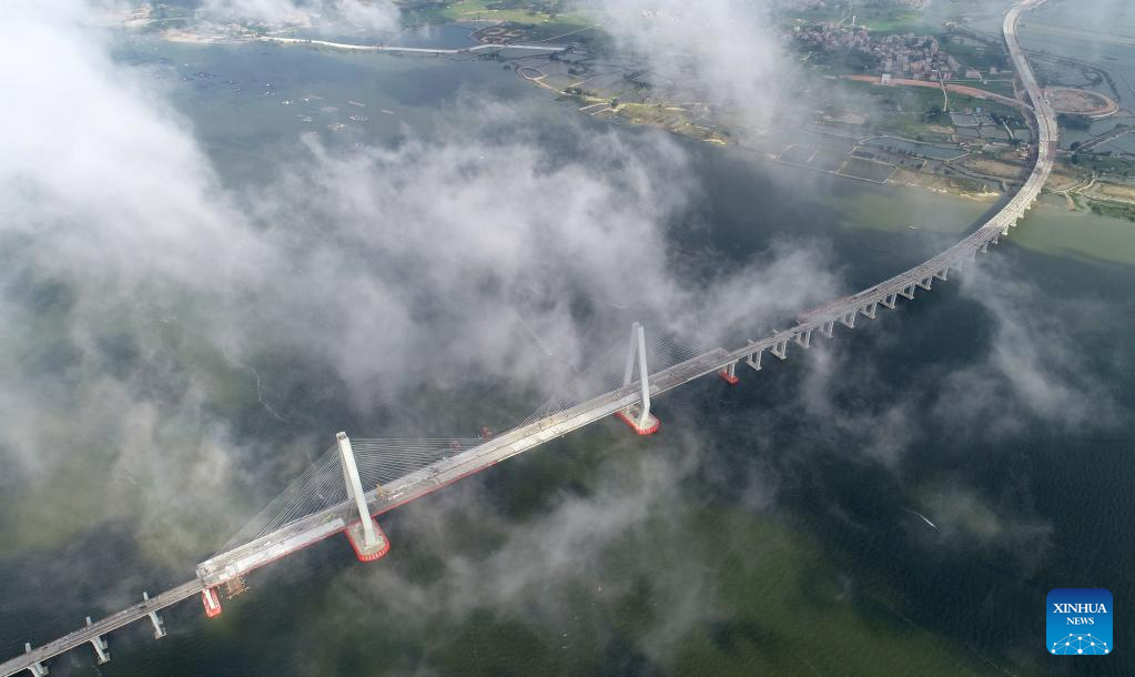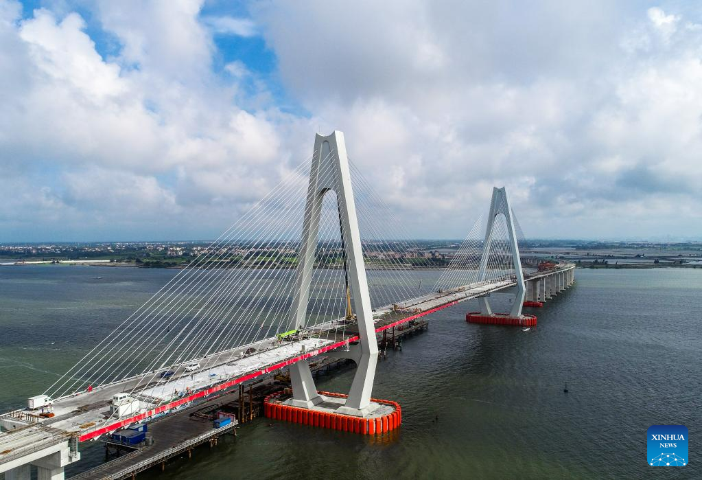 This aerial photo taken on May 25, 2023 shows the Luzhou grand bridge under construction in Zhanjiang City, south China's Guangdong Province. The cross-sea Luzhou grand bridge, with a total length of 562 meters and a main span of 300 meters, has entered the final stage of construction. (Xinhua/Lu Hanxin)