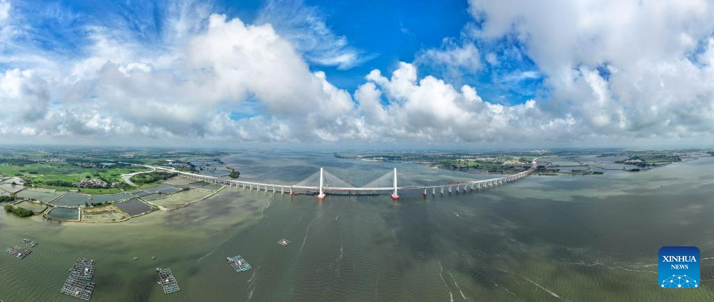 This aerial panoramic photo taken on May 25, 2023 shows the Luzhou grand bridge under construction in Zhanjiang City, south China's Guangdong Province. The cross-sea Luzhou grand bridge, with a total length of 562 meters and a main span of 300 meters, has entered the final stage of construction. (Xinhua/Mao Siqian)