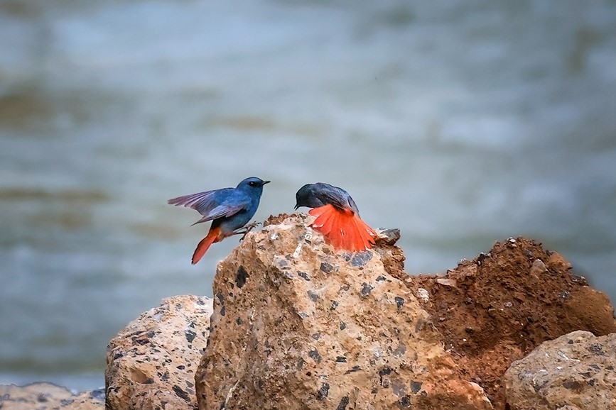Plumbeous water redstarts playing on a rock in Henan Anyang Zhanghe Canyon National Wetlands Park in Anyang city, central China's Henan Province. (Photo/Duan Xianzhong)