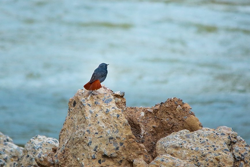A plumbeous water redstart perches on a rock in Henan Anyang Zhanghe Canyon National Wetlands Park in Anyang city, central China's Henan Province. (Photo/Niu Wentang)