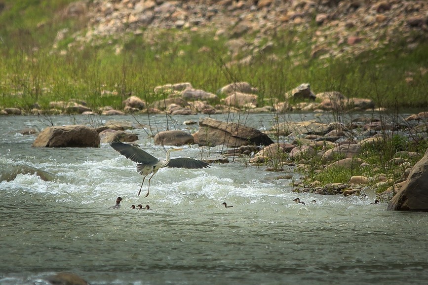 A grey heron and wild ducks frolick in water in Henan Anyang Zhanghe Canyon National Wetlands Park in Anyang city, central China's Henan Province. (Photo/Niu Wentang)