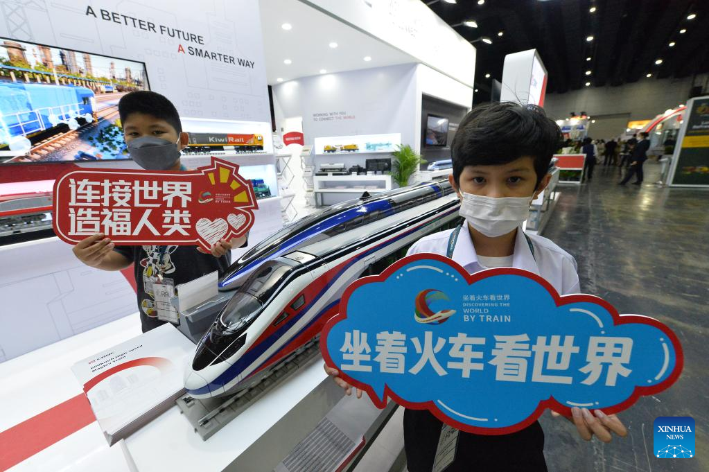 Children pose for a photo with the train models of China Railway Rolling Stock Corporation (CRRC) during Asia Pacific Rail 2023 in Bangkok, Thailand, on May 31, 2023. CRRC held a series of activities themed on "Discovering the world by train" during the exhibition, displaying diverse models of Chinese-made trains. (Xinhua/Rachen Sageamsak)