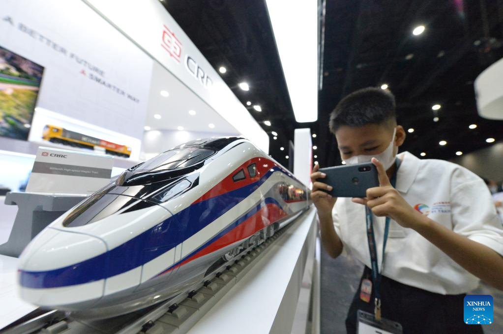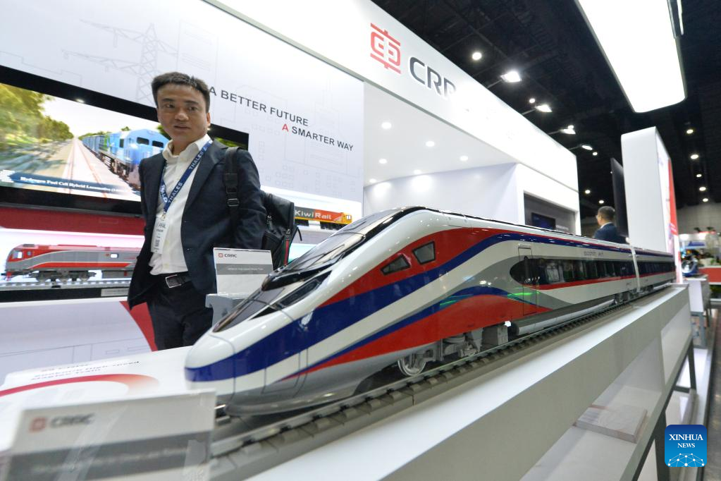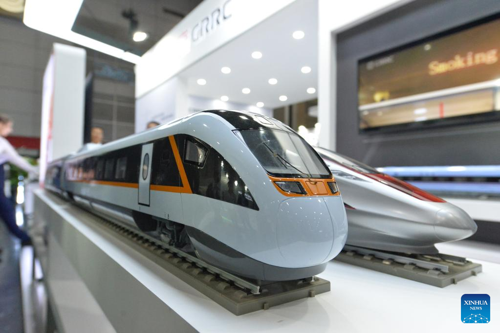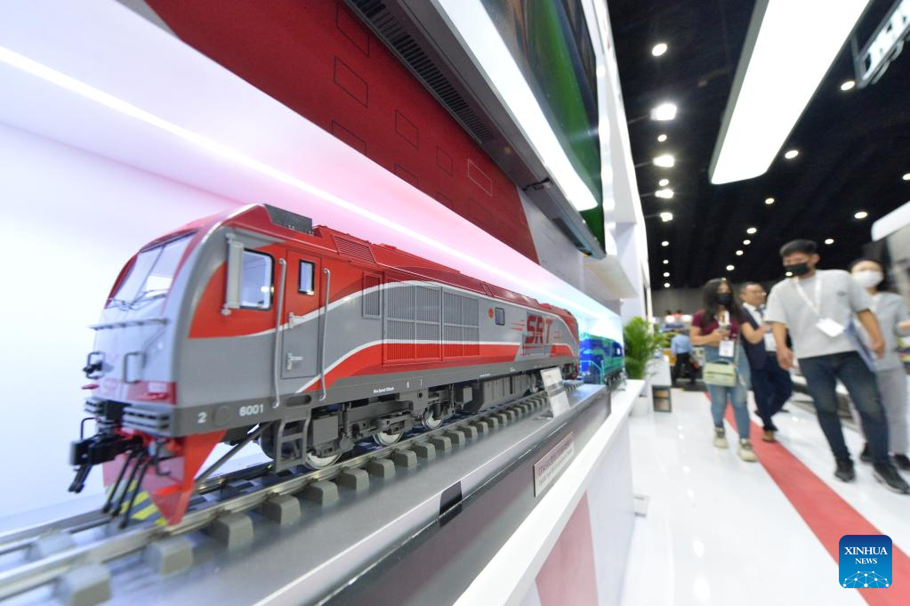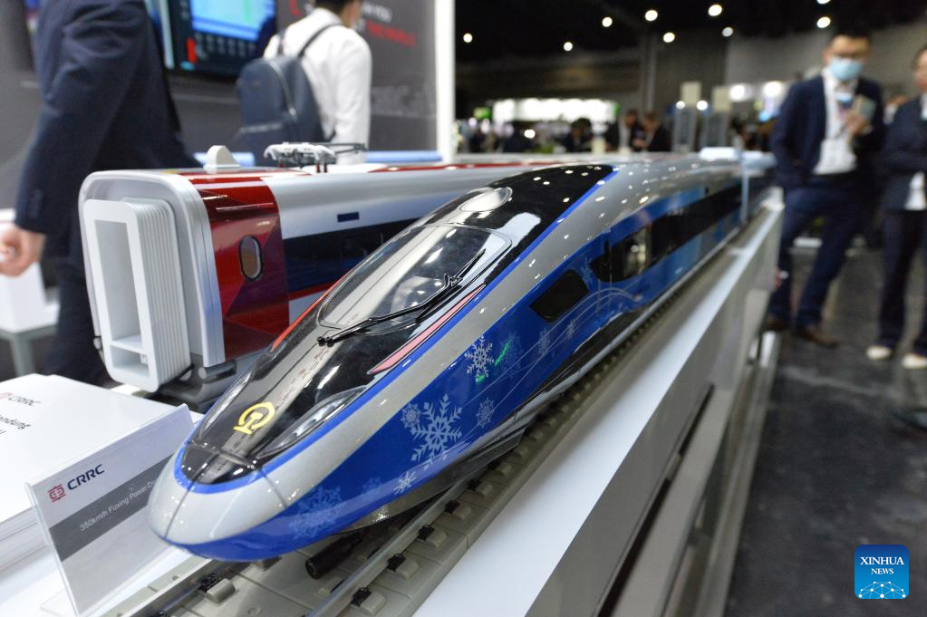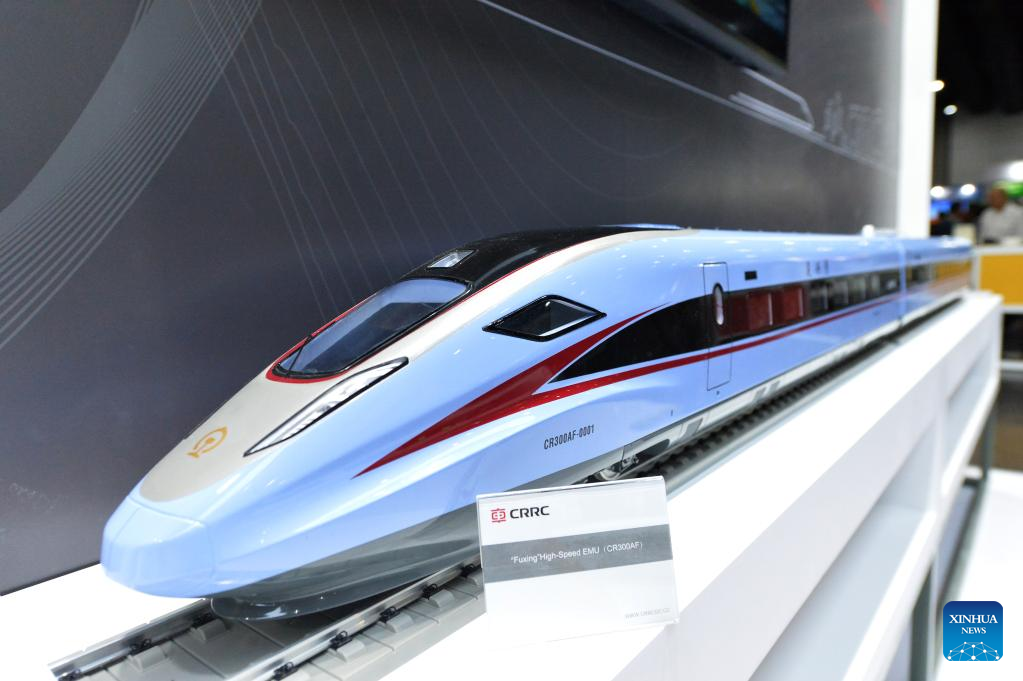 Train models of China Railway Rolling Stock Corporation (CRRC) are pictured during Asia Pacific Rail 2023 in Bangkok, Thailand, on May 31, 2023. CRRC held a series of activities themed on "Discovering the world by train" during the exhibition, displaying diverse models of Chinese-made trains. (Xinhua/Rachen Sageamsak)