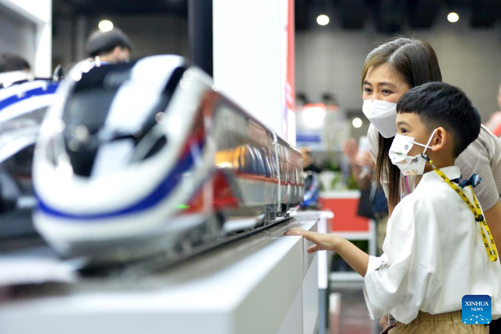 Visitors view the train models of China Railway Rolling Stock Corporation (CRRC) during Asia Pacific Rail 2023 in Bangkok, Thailand, on May 31, 2023. CRRC held a series of activities themed on "Discovering the world by train" during the exhibition, displaying diverse models of Chinese-made trains. (Xinhua/Rachen Sageamsak)