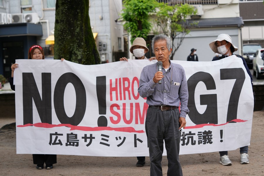 People rally at Hiroshima's Funairi Daiichi Park in a protest against the Group of Seven (G7) summit in Hiroshima, Japan, May 19, 2023. (Xinhua/Zhang Xiaoyu)