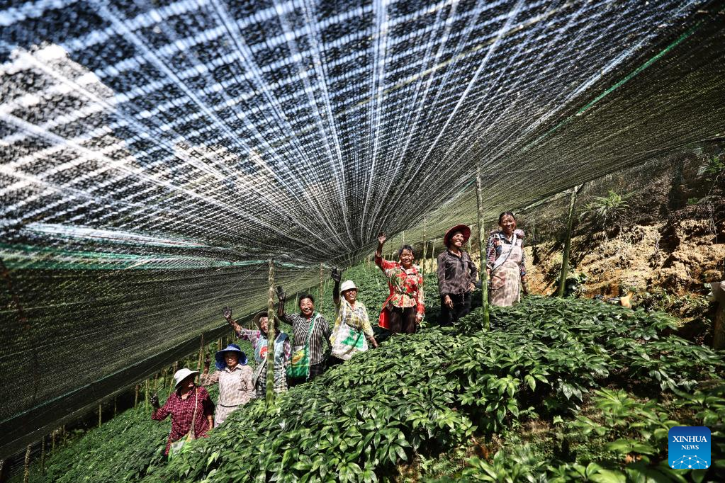 Farmers work at a panax notoginseng cultivation base in Lianhuatang Township of Xichou County, Wenshan Zhuang and Miao Autonomous Prefecture, southwest China's Yunnan Province, May 31, 2023.?(Xinhua/Lan Hongguang)