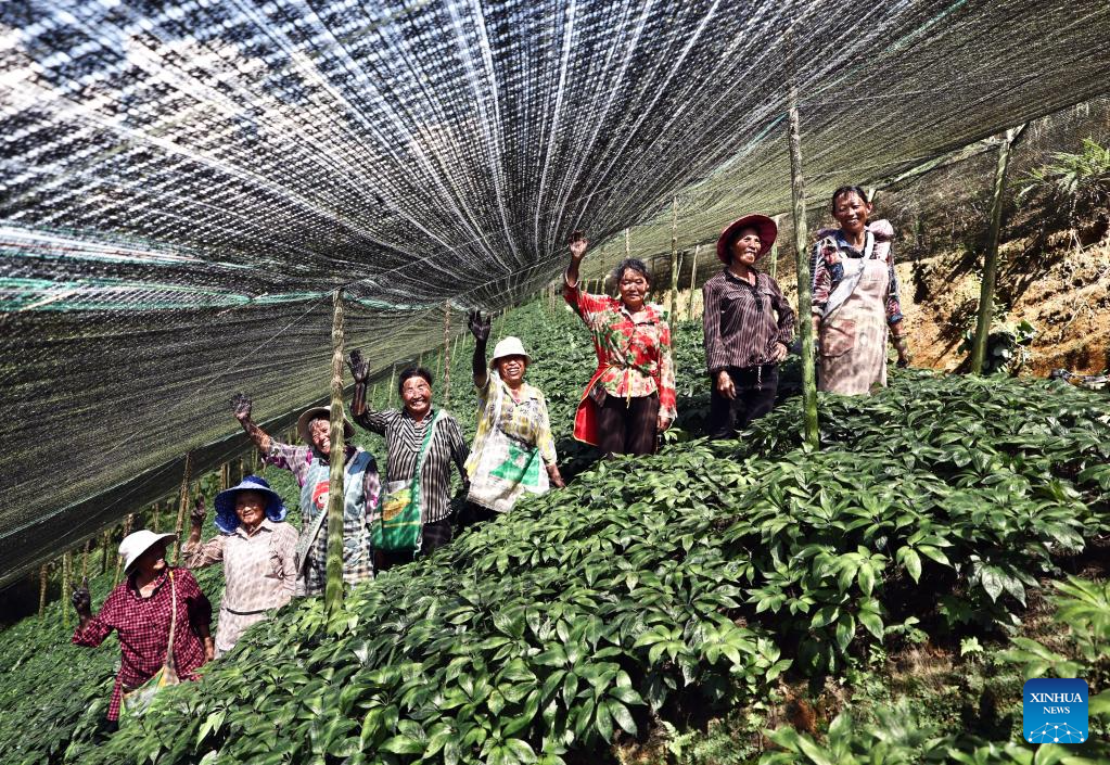 Farmers are pictured at a panax notoginseng cultivation base in Lianhuatang Township of Xichou County, Wenshan Zhuang and Miao Autonomous Prefecture, southwest China's Yunnan Province, May 31, 2023.?(Xinhua/Lan Hongguang)