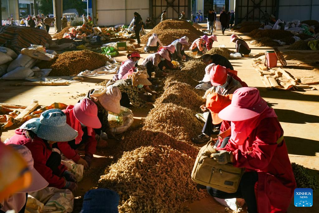 People sort panax notoginseng products at a market in Wenshan Zhuang and Miao Autonomous Prefecture, southwest China's Yunnan Province, Nov. 27, 2022.?(Photo by Yang Denghong/Xinhua)