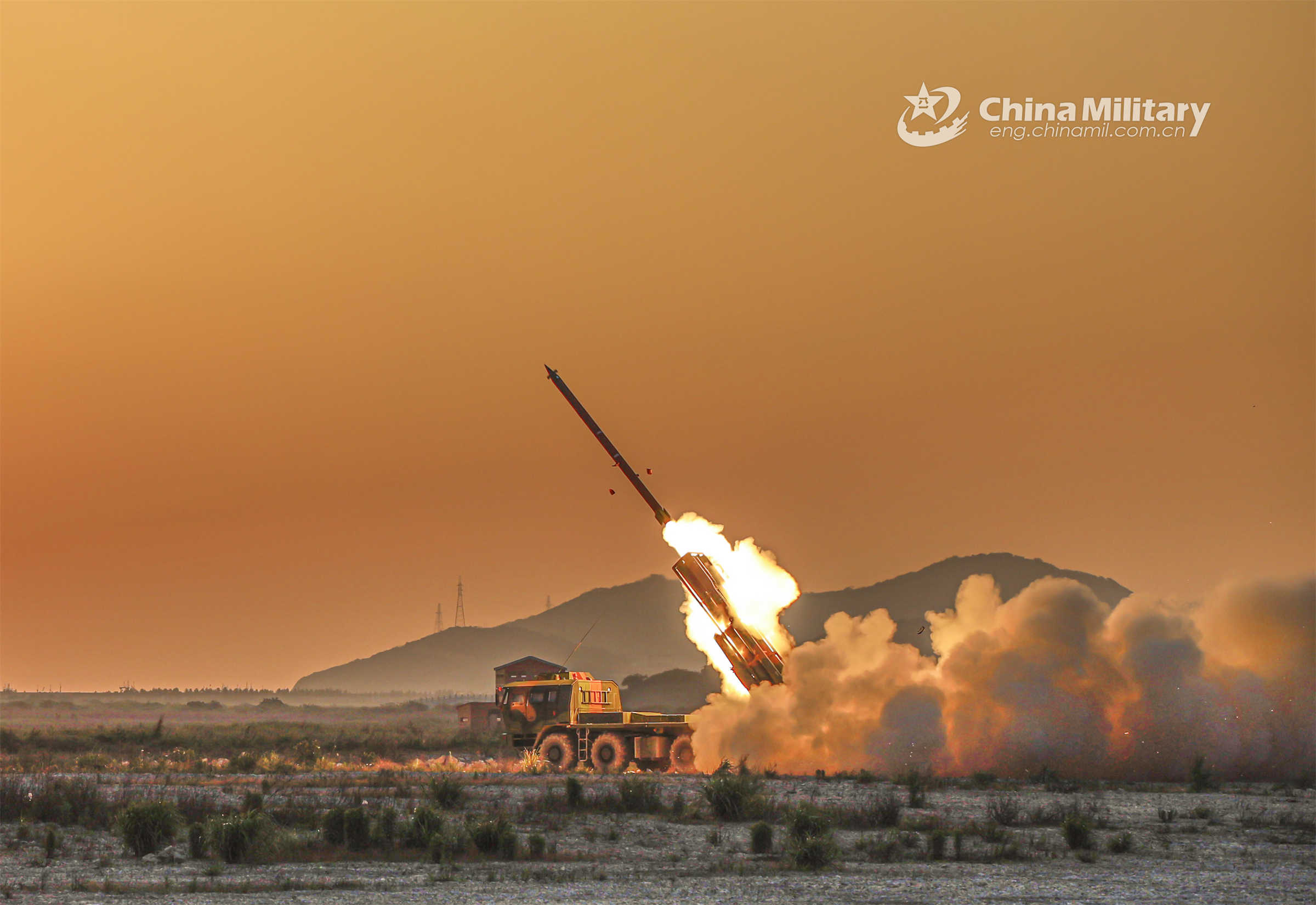 Long-range multiple rocket launcher systems (MRLS) attached to a brigade under the PLA 72nd Group Army fire at mock targets during a live-fire exercise in unfamiliar terrain on May 10, 2023. (eng.chinamil.com.cn/Photo by Zhuang Haoning)