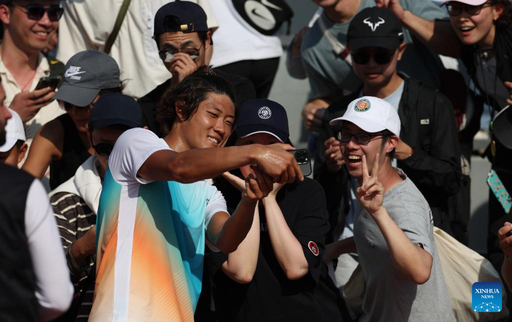 Zhang Zhizhen of China takes a selfie after the men's singles second round match between Zhang Zhizhen of China and Thiago Agustin Tirante of Argentina at the French Open tennis tournament at Roland Garros in Paris, France, on June 1, 2023. (Xinhua/Gao Jing)