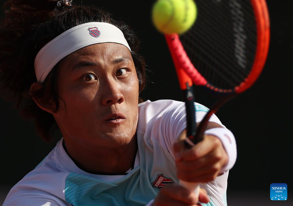 Zhang Zhizhen of China competes during the men's singles second round match between Zhang Zhizhen of China and Thiago Agustin Tirante of Argentina at the French Open tennis tournament at Roland Garros in Paris, France, on June 1, 2023. (Xinhua/Gao Jing)