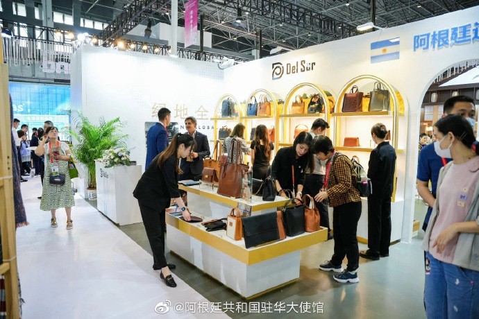People visit a booth exhibiting Argentine products at the third China International Consumer Products Expo in Haikou, south China's Hainan province, April 11. (Photo from the official page of the Argentine Embassy in China on Weibo)