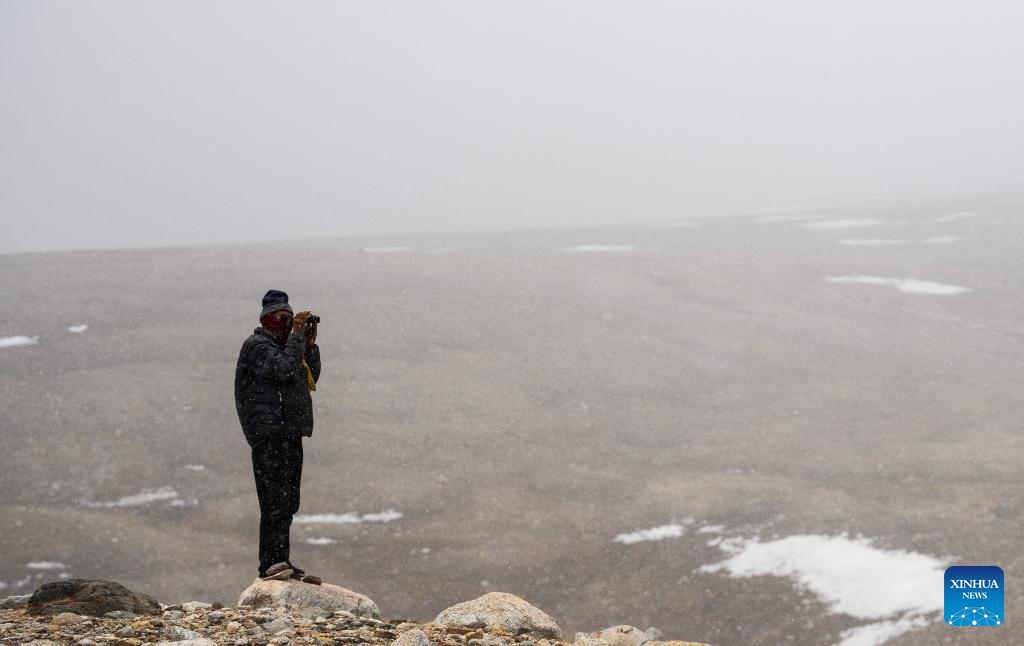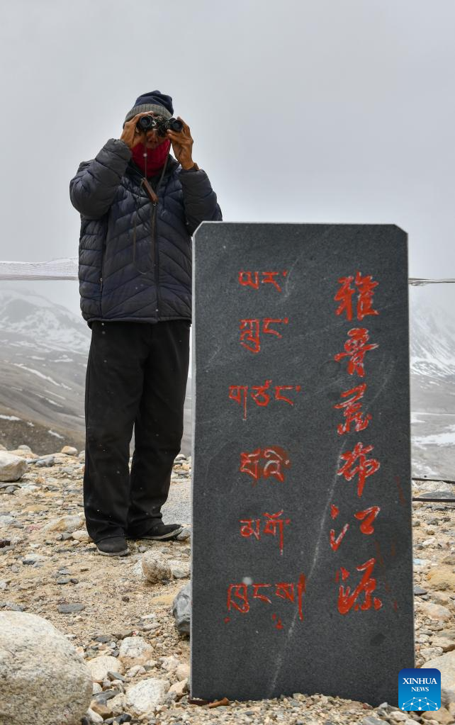 A local herdsman looks at the Gyaimaryangzhong Glacier through binoculars in southwest China's Tibet Autonomous Region, May 31, 2023. The Gyaimaryangzhong Glacier is the source of the Yarlung Zangbo River, China's longest plateau river. (Xinhua/Jigme Dorje)