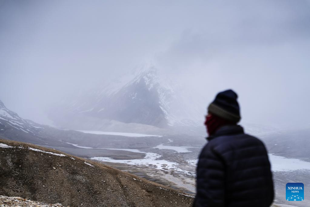 A local herdsman looks at the Gyaimaryangzhong Glacier in southwest China's Tibet Autonomous Region, May 31, 2023. The Gyaimaryangzhong Glacier is the source of the Yarlung Zangbo River, China's longest plateau river. (Xinhua/Fei Maohua)